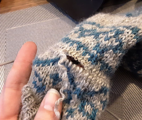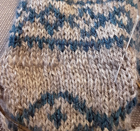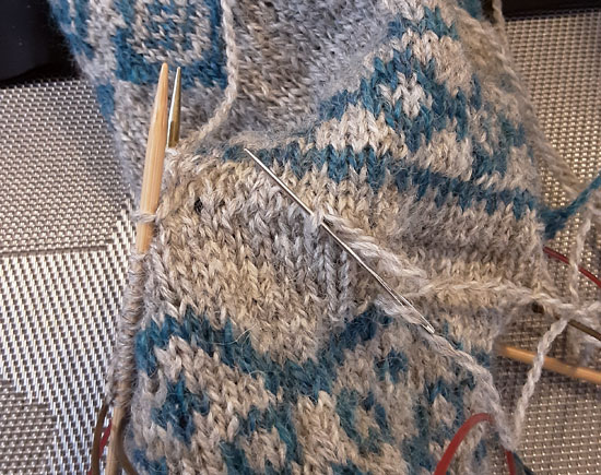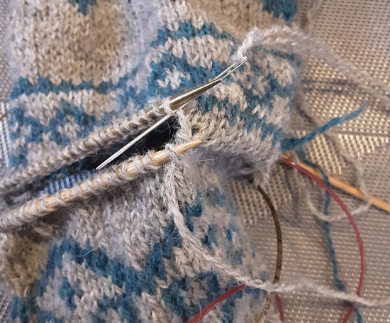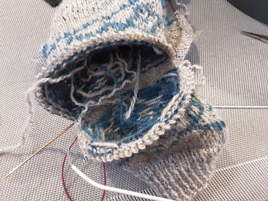 Als nächstes werden die fehlenden Reihen angestrickt. Ich habe dazu das Garn per spit splicing miteinander verbunden, so habe ich zwei Enden weniger zu vernähen.