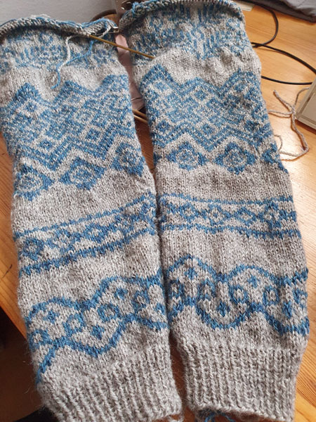 Bei meinem letzten großen Strickprojekt musste ich kurz nach dem Start eine lange, gesundheitsbedingte Pause machen. Als ich wieder starten durfte, habe ich die Anleitung natürlich nicht richtig gelesen und habe prompt einen Fehler gemacht: Zwischen den Musterbändern sollten zusätzlich jeweils 5 Reihen einfarbig eingestrickt werden. Das habe ich erst gesehen, als ich die Anleitung wieder genommen habe, um den zweiten Ärmel anzuschlagen.