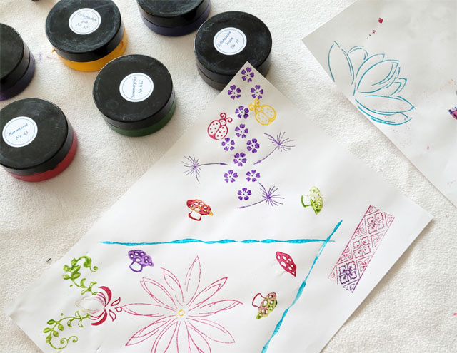 Als Unterlage eignen sich alle glatten, möglichst ebenen Flächen einer gewissen Größe. Die Originalfarben sind ungiftig. Bei anderen Textilfarben musst Du schauen.