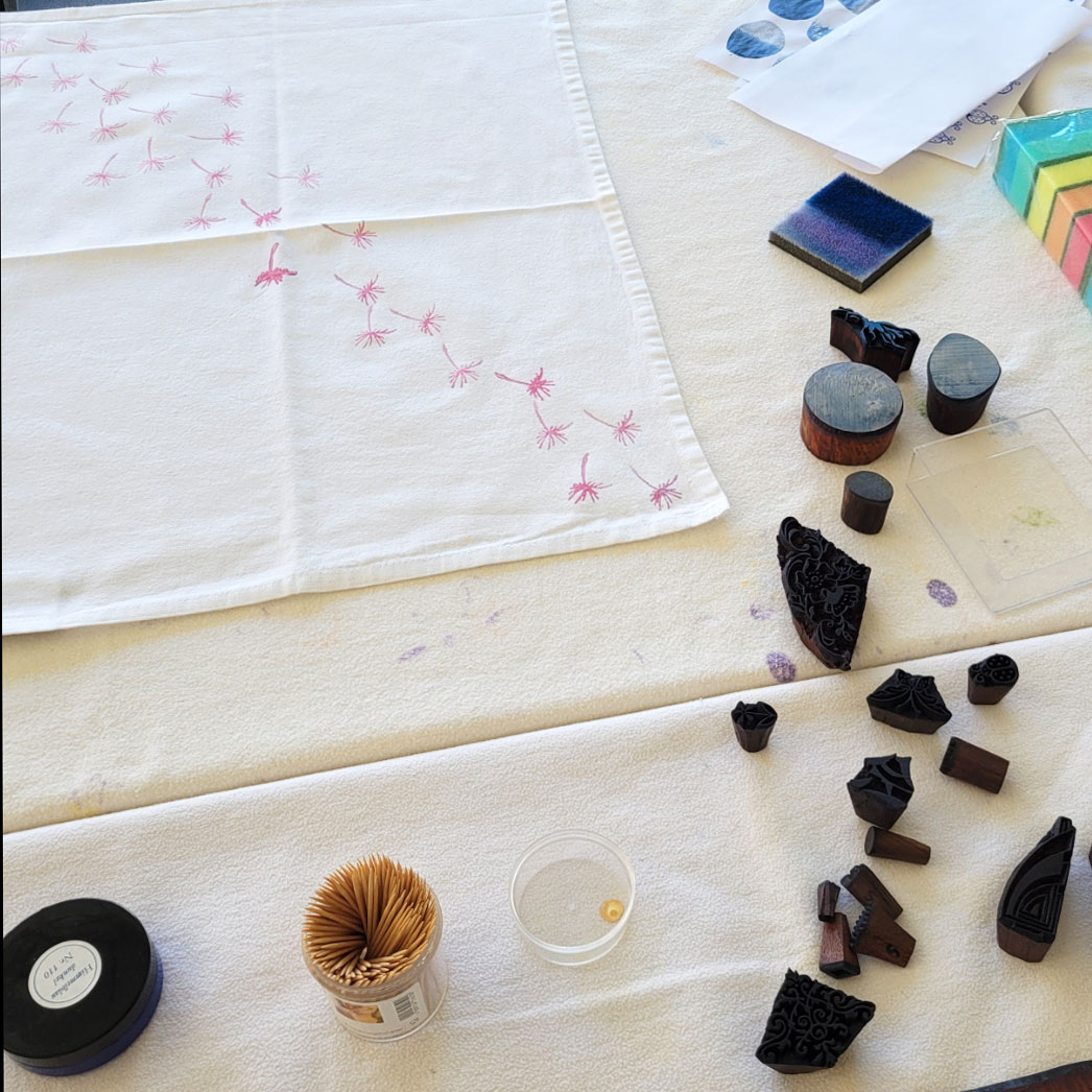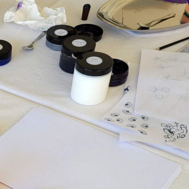Schon seit vielen Jahren bin ich ein großer Fand von Blauweisschen, der Blaudruckerei im Münsterland. Dort habe ich meinen ersten Druckworkshop vor rund 20 Jahren gemacht. Viele schöne Sachen habe ich bedruckt, vor allem Kleidung, aber auch Decken und Servietten und andere Dekotextilien. Im letzten Jahr habe ich das erste Mal Blaudruck für Kinder angeboten, im Rahmen der Neuberger Ferienspiele. Und in diesem Jahr hat es endlich geklappt, Blaudruck auch mal für Erwachsene als Workshop anzubieten!