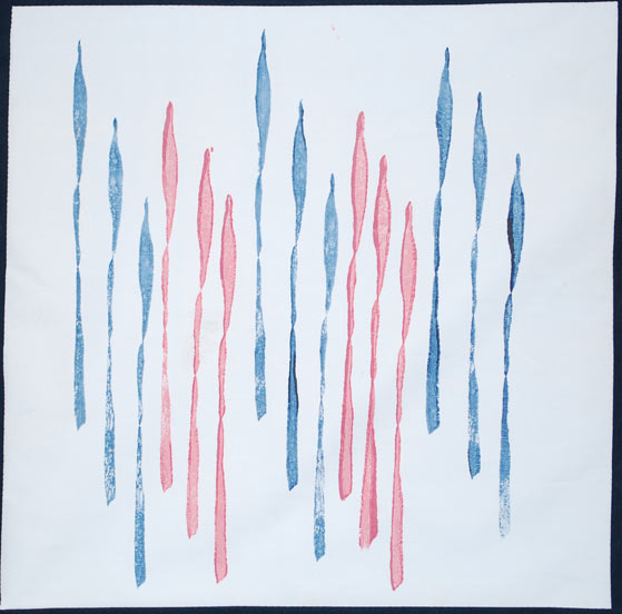 Zum Drucken gibt man einen Klacks Farbe auf eine Unterlage und stippt einen Spülschwamm rein (ja, tatsächlich, einen Spülschwamm!). Den Spülschwamm benutzt man dann wie ein Stempelkissen und färbt damit den Druckstock ein. Dann kann man drucken. Vor dem nächsten Druck färbt man das Model wieder ein.